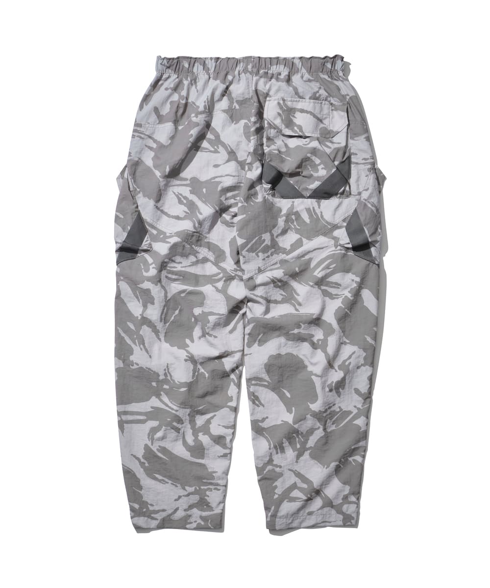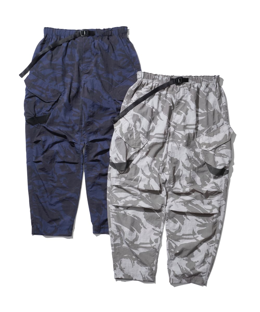 大きく前傾角度を付けたスラントポケットが特徴の英ロイヤルネイビー型カーゴパンツをアウトドアパンツに転じさせたパンツは、通称”Shoegazeカモ”を施したタスランナイロンを採用。撥水・透湿・速乾といったアウトドア対応型スペックの充実も魅力。