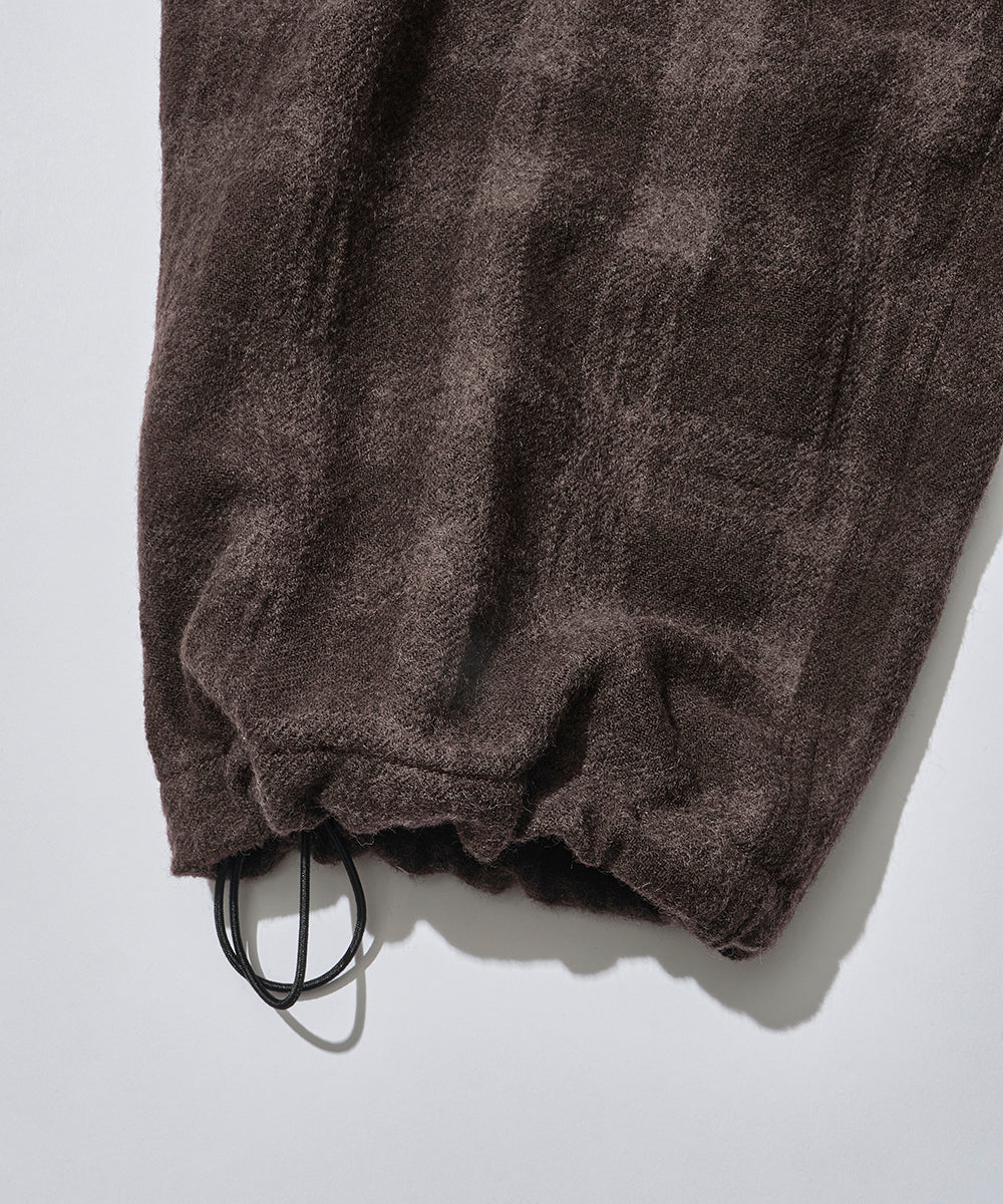クライミングパンツの源流とも言われるDoogie(=道着)の名を持つ新型クライミングパンツ。フォルムは、9部丈のバギーシルエット。生地は、秋冬らしい落ち着いた色めのプレイド縮絨ウール。同素材のトップス、MTR4164 / Coach Shirt +とセットアップ推奨です。