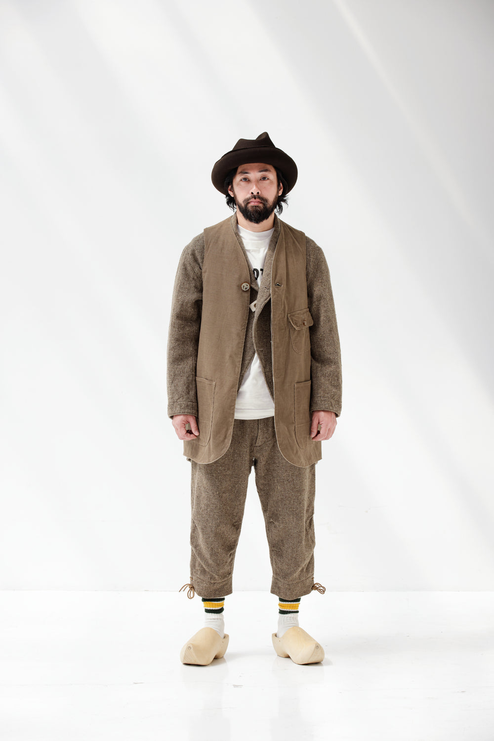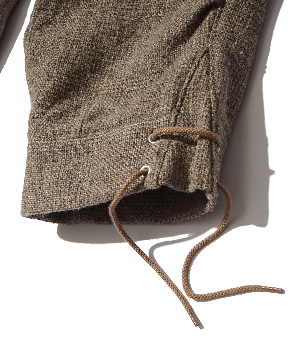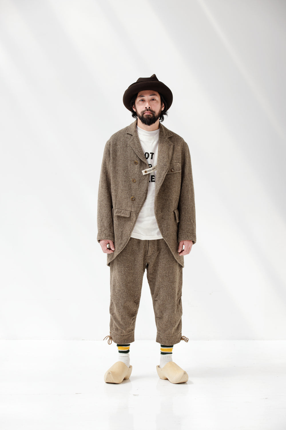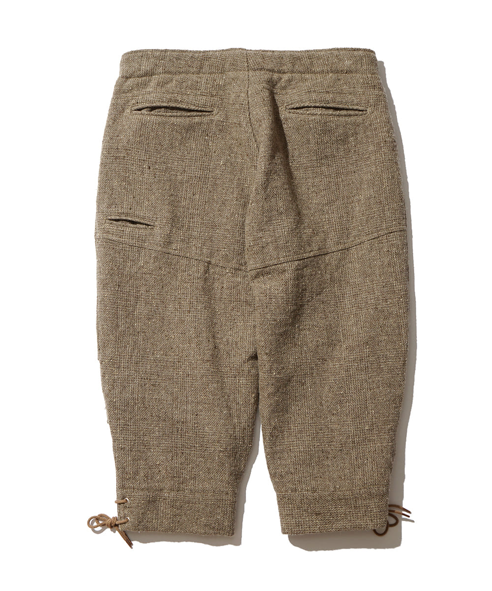 古き山岳民のパンツ、ニッカーボッカーズ改め”ニックス”。マウンテンリサーチの初期衝動(2016年)である定番ボトム、通称ニッカーズが山の正装着として再びにして、M.F.T.ならではのLOOSE FIT狙いの大胆なシルエット改訂バージョン。本作は前述のベストと同じく2素材による展開。こちらはジャケットの一群と同様のツイード版。