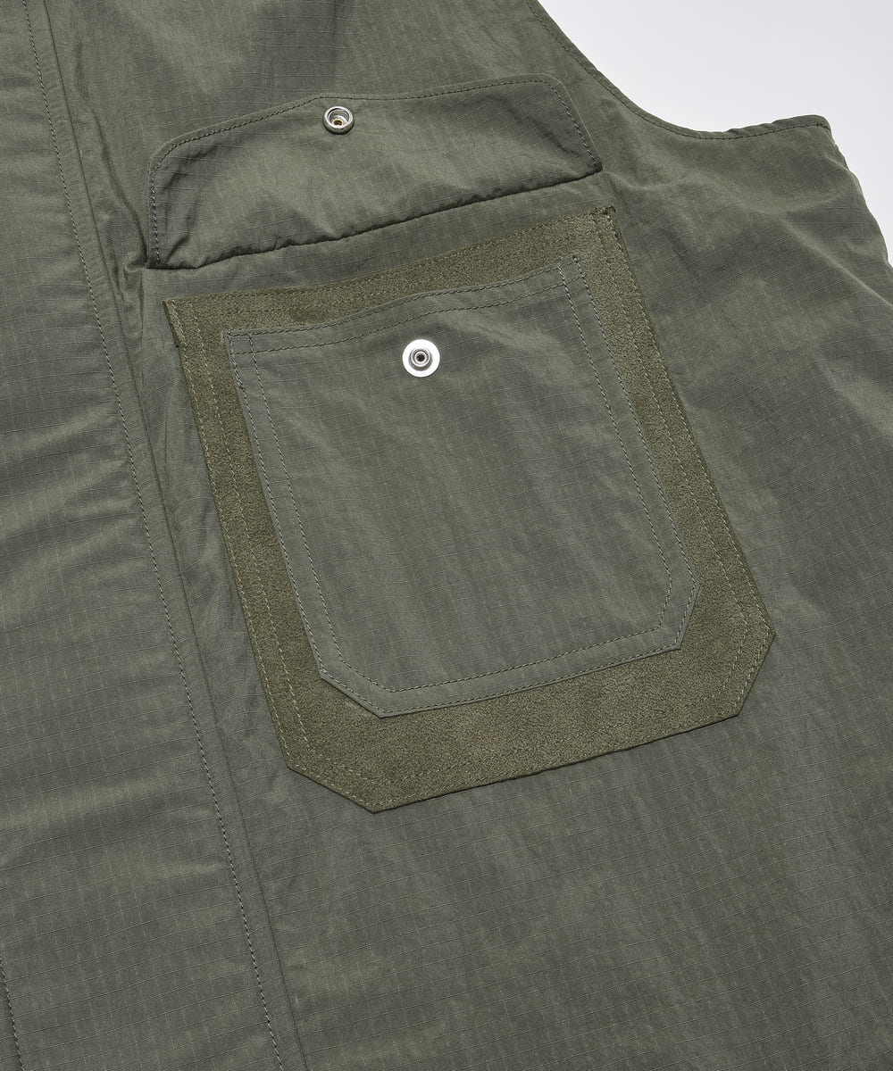 リップストップナイロン生地を使用したミリタリーベスト。M-69ボディーアーマーの特徴的な襟とフロントフライに着想を得て、FL社由来のマルチフラップポケットを配した個性的なフロントデザインが目を引きます。ミリタリー由来の無骨な佇まいに、軽やかな着心地を掛け合わせた一着です。