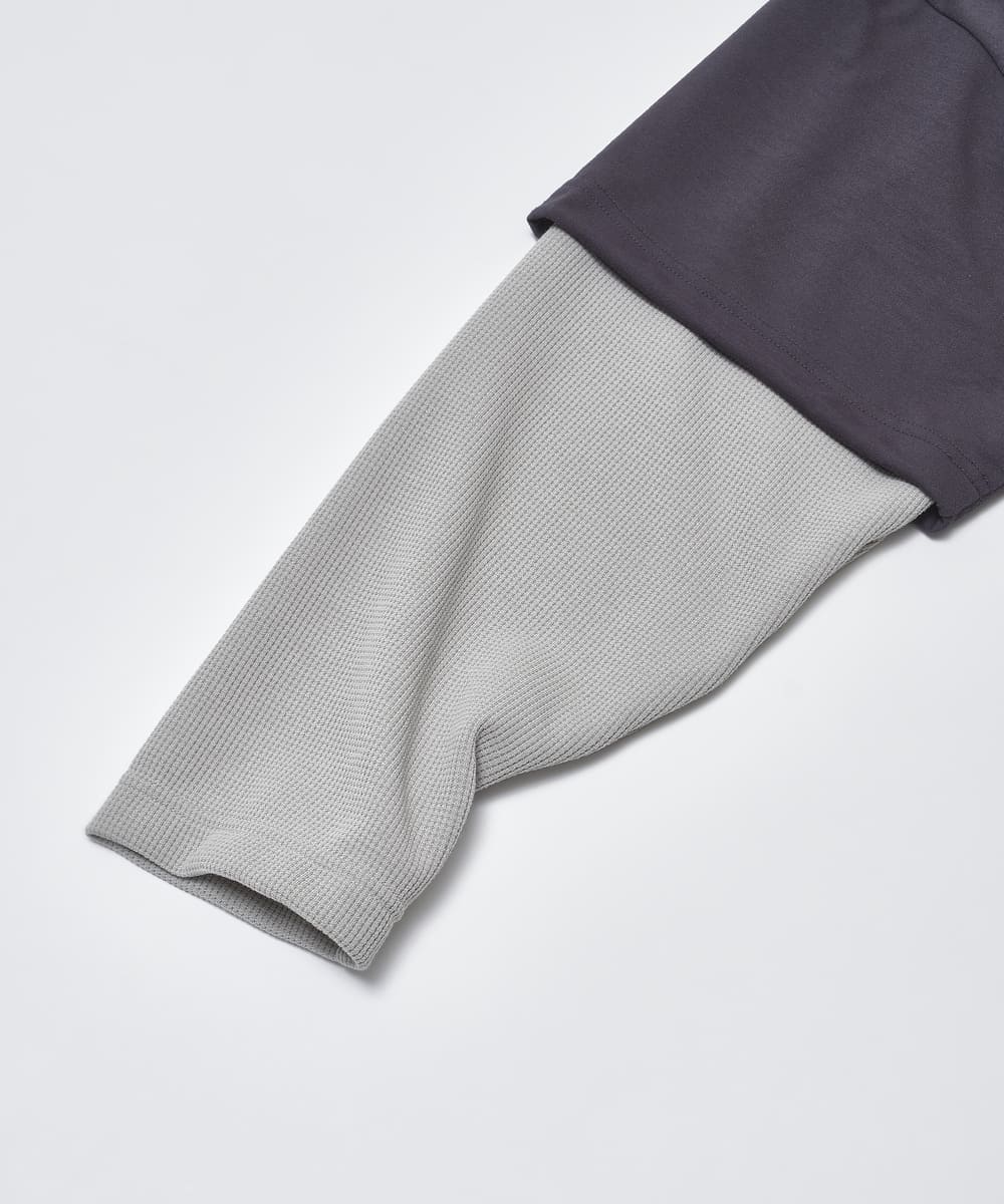 速乾天竺と速乾ワッフルを組み合わせたレイヤードTシャツ。アームホールから重なる異なる素材のコントラストが映える一枚。背面にはA.M.プリント入り。素...