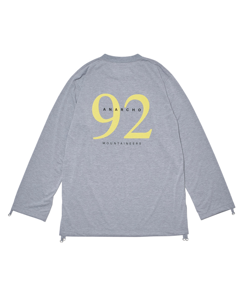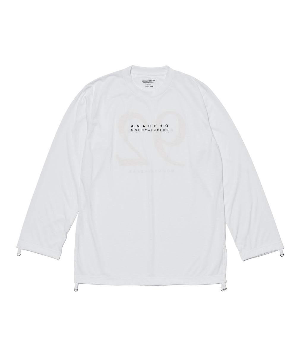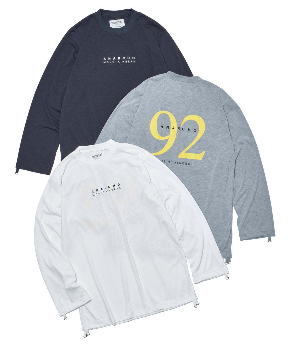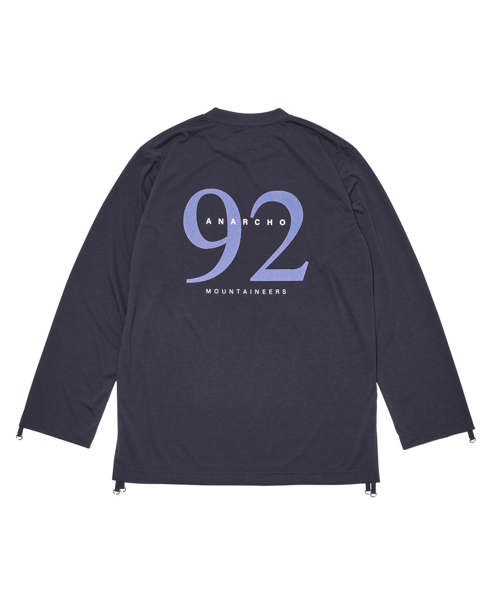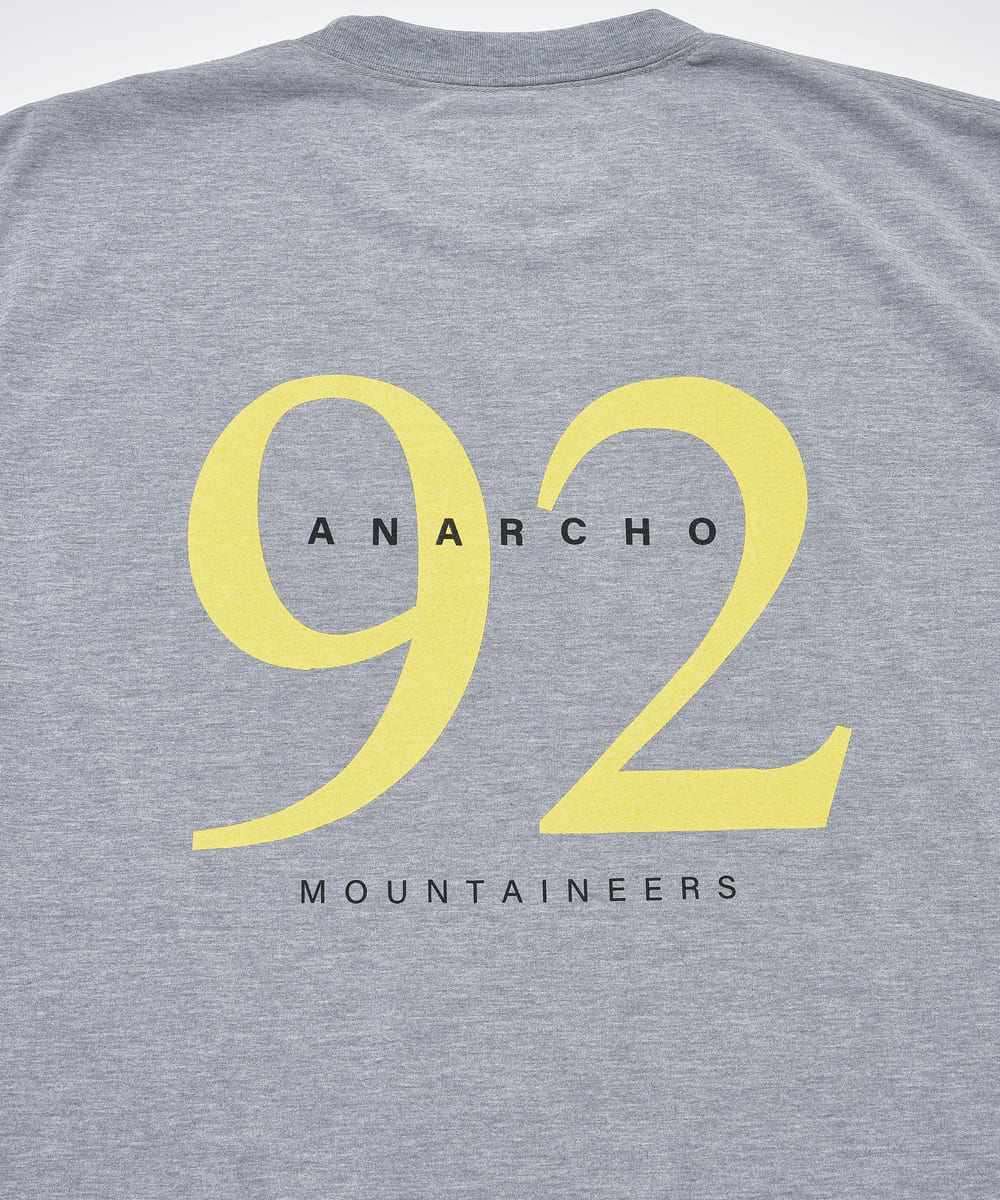 速乾素材もパンク方向に転換といった発想はマウンテンリサーチならでは。クイックドライ素材のモスリンシャツは、街ではもちろん、山のレイヤースタイル事情に変化を加える1着の予感。前後に、Anarcho Mountaineers、さらに背中には今期を象徴するキーワードである“92”がプリントされています。